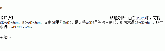 如图,在?ABCD中,已知AD=8cm,AB=6cm,DE平分∠ADC交BC边于点E,则BE等于( )
