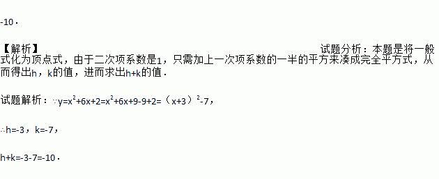 -10. 【解析】试题分析:本题是将一般式化为顶点式,由于二次项系数是1,只需加上一次项系数的一半的平方来凑成完全平方式,从而得出h,k的值,进而求出h+k的值. 试题解析:∵y=x2+6x+2=x2+6x+9-9+2=(x+3)2-7, ∴h=-3,k=-7, h+k=-3-7=-10.