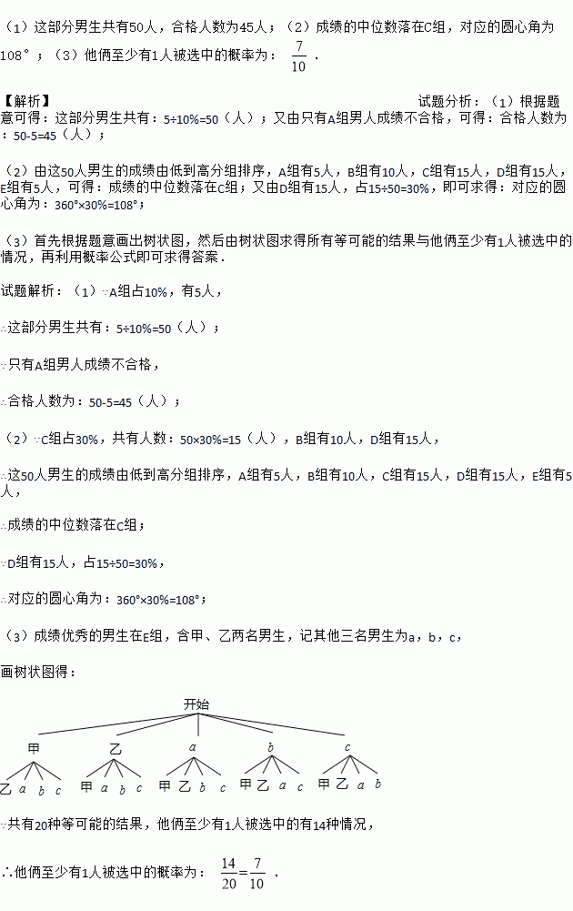 (2)这部分男生成绩的中位数落在哪一组?扇形统计图中D组对应的圆心角是多少度?