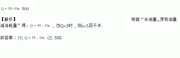汽车行驶前,油箱中有油55升,已知每百千米汽车耗油10升,油箱中的余油量Q(升)与它行驶的距离s(百千米)之间的函数关系式为_______________;为了保证行车安全,油箱中至少存油5升,则汽车最多可行驶____________千米.