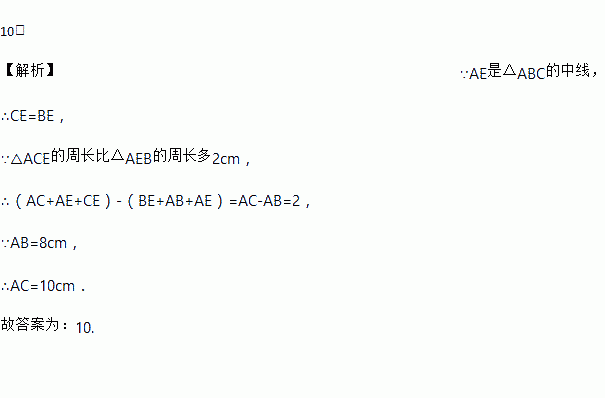 如图,已知AE是△ABC的边BC上的中线,若AB=8cm,△ACE的周长比△AEB的周长多2cm,则AC=_____cm.