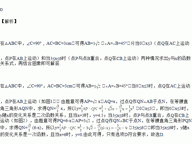 cm/s的速度沿AB方向运动到点B.动点Q同时从点A出发,以1cm/s的速度沿折线ACCB方向运动到点B.设△APQ的面积为y(cm2).运动时间为x(s),则下列图象能反映y与x之间关系的是 ( )![]()