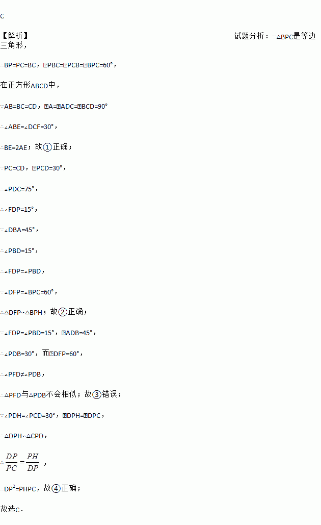 如图,在正方形ABCD中,△BPC是等边三角形,BP,CP的延长线分别交AD于点E,F,连接BD,DP,BD与CF交于点H.下列结论:①BE=2AE;②△DFP∽△BPH;③△PFD∽△PDB;④DP2=PH•PC,其中正确的结论是