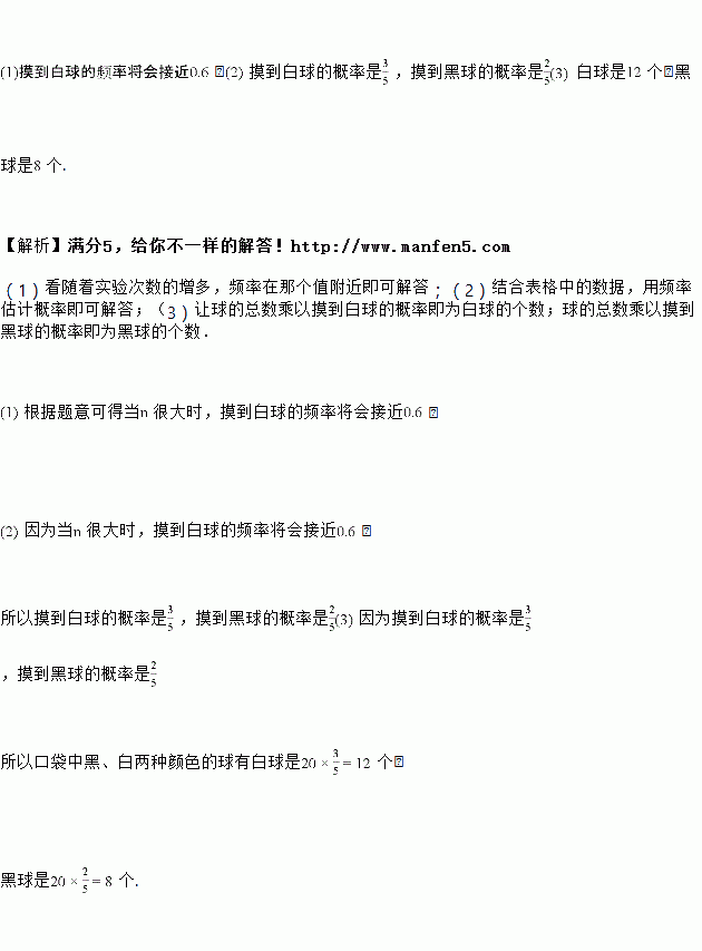 ÔÚÒ»¸ö²»Í¸Ã÷µÄ¿Ú´üÀï×°ÓÐÖ»ÓÐÑÕÉ«²»Í¬µÄºÚ¡¢°×Á½ÖÖÑÕÉ«µÄÇò¹²¸ö£¬Ä³Ñ§Ï°Ð¡×é×öÃþÇòÊÔÑ飬½«Çò½ÁÔȺ󣬴ÓÖÐËæ»úÃþ³öÒ»¸öÇò¼ÇÏÂÑÕÉ«£¬ÔÙ°ÑËü·Å»Ø´üÖУ¬²»¶ÏÖØ¸´£¬Ï±íÊǻ½øÐÐÖеÄÒ»×éͳ¼ÆÊý¾Ý£º![]()