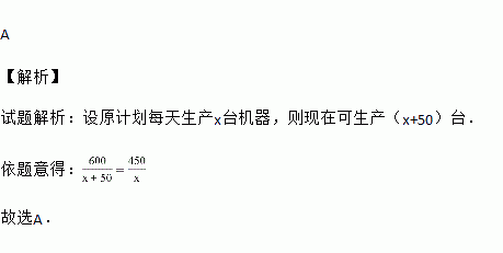 某工厂进行技术创新,现在每天比原计划多生产50台机器,并且现在生产600台机器所需时间与原计划生产450台机器所需时间相同,设现在每天生产x台机器,根据题意可列方程为( )