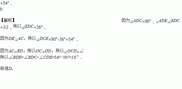 如图,矩形ABCD中,DE⊥AC于E,且∠ADE:∠EDC=3:2,则∠BDE的度数为( )