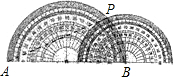 分析:依题意,设大量角器的左端点为A,小量角器的圆心为B.利用三角形的内角和定理求出∠PAB的度数.然后根据圆的知识可求出大量角器上对应不度数.