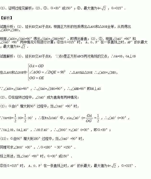 如图1,点O是正方形ABCD两对角线的交点,分别延长OD到点G,OC到点E,使OG=2OD,OE=2OC,然后以OG、OE为邻边作正方形OEFG,连接AG,DE.