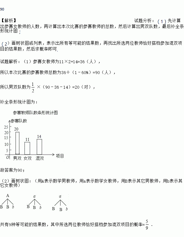 我校4月份举办了教职工羽毛球赛,本次比赛共分三个项目:男双、女双和混双.比赛规定参赛男教师只能在男双或混双中选报一项,参赛女教师只能在女双或混双中选报一项,现将参赛人数和各项的参赛队数(两人组成一队)绘制成了如下不完整的统计图: