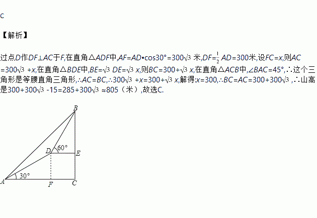 某测量队在山脚A处测得山上树顶仰角为45°(如图),测量队在山坡上前进600米到D处,再测得树顶的仰角为60°,已知这段山坡的坡角为30°,如果树高为15米,则山高为( )(精确到1米,