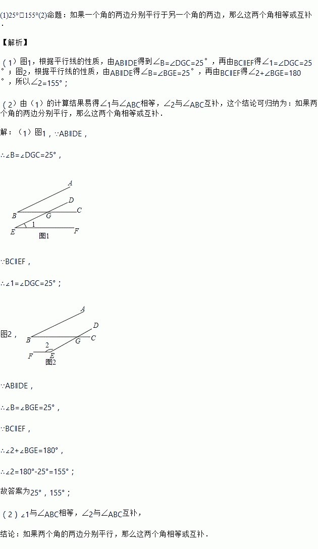 (2)请观察∠1、∠2分别与∠ABC有怎样的关系,归纳出一个命题.