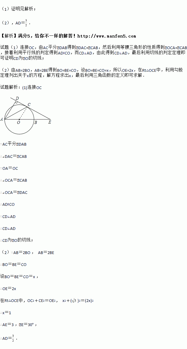 如图,已知AB是⊙O的直径,锐角∠DAB的平分线AC交⊙O于点C,作CD⊥AD,垂足为D,直线CD与AB的延长线交于点E.