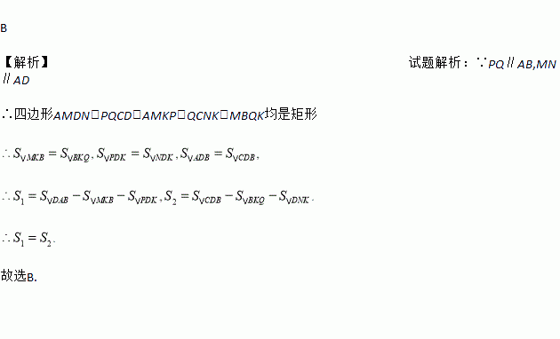 如图,过矩形ABCD的对角线上一点K,分别作矩形两边的平行线MN和PQ,那么图中矩形AMKP的面积S1和矩形QCNK的面积S2的大小关系是( )