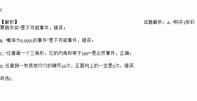 C 【解析】试题解析:A. “购买1张彩票就中奖”是不可能事件,错误; B. “概率为0.0001的事件”是不可能事件,错误; C. “任意画一个三角形,它的内角和等于180°”是必然事件,正确; D. 任意掷一枚质地均匀的硬币10次,正面向上的一定是5次,错误. 故选C.