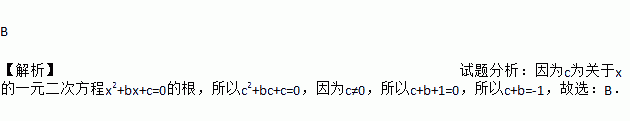 B 【解析】试题分析:因为c为关于x的一元二次方程x2+bx+c=0的根,所以c2+bc+c=0,因为c≠0,所以c+b+1=0,所以c+b=-1,故选:B.