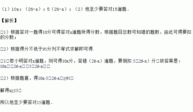 为弘扬中华优秀传统文化,某中学在全校开展诵读古诗词竞赛活动.测试题共有27道题,评分办法规定:答对一道题得10分,不答得0分,答错一道题倒扣5分,小明有1道题未答,他若得分不低于95分,至少要答对几道题?