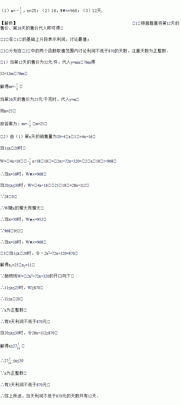 且第12天的售价为32元/千克,第26天的售价为25元/千克.已知种植销售蓝莓的成木是18元/千克,每天的利润是W元(利润=销售收入﹣成本).