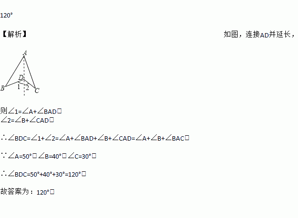 如图所示,∠A=50°,∠B=40°,∠C=30°,则∠BDC=________.