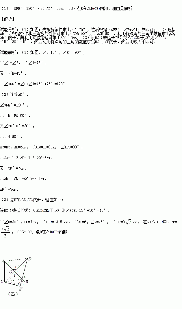 三角板DCE绕点C顺时针旋转15°得到△D′CE′,如图乙.这时AB与CD′相交于点O,D′E′与AB相交于点F,连接AD′.