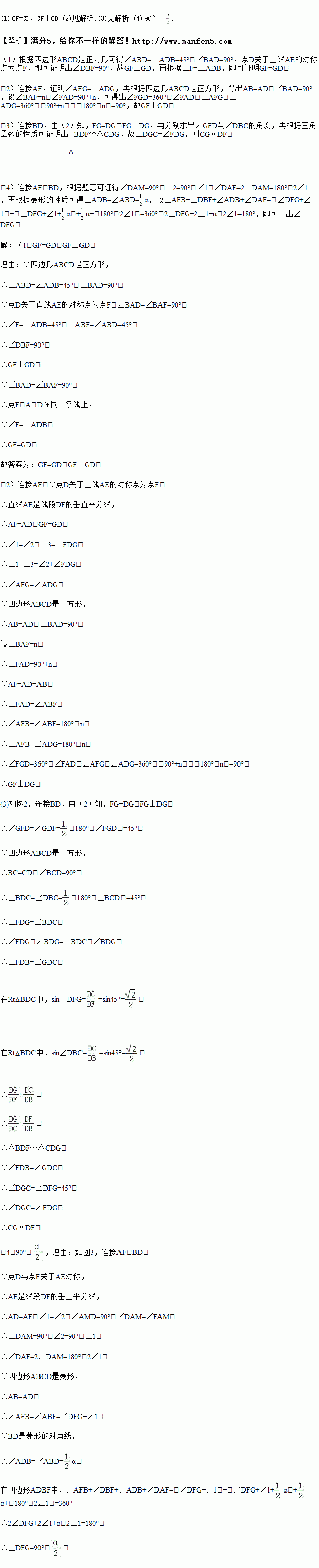 (4)如图3若将题中的“正方形ABCD”变为“菱形ABCD“,∠ABC=α,其余条件不变,请探究∠DFG的度数,并直接写出结果(用含α的式子表示).