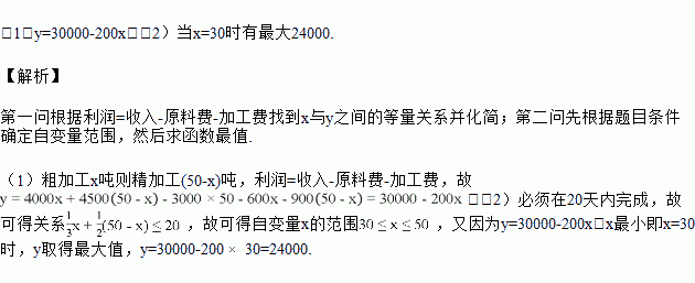 (1)设其中粗加工x吨,获利y元,求y与x的函数关系式(不要求写自变量的范围);