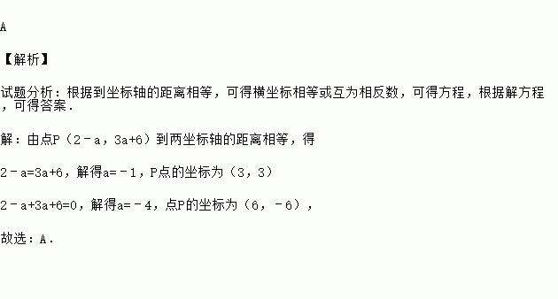 已知点P(2﹣a,3a+6)到两坐标轴的距离相等,则点P的坐标为( )