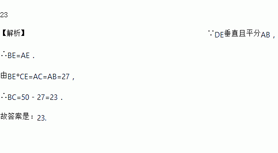 如图,在等腰在△ABC中,AB=27,AB的垂直平分线交AB于点D,交AC于点E,若在△BCE的周长为50,则底边BC的长为_____.