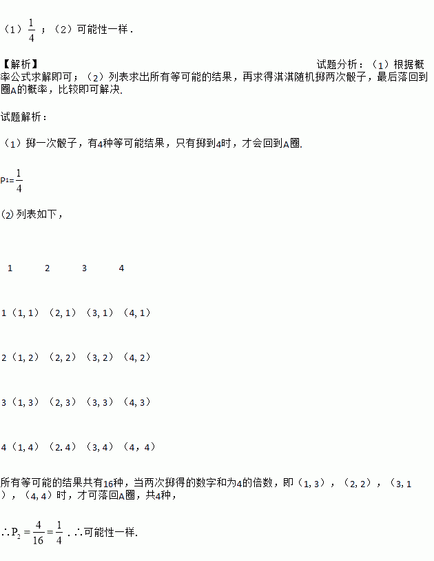 (2)淇淇随机掷两次骰子,用列表法求最后落回到圈A的概率P2,并指出她与嘉嘉落回到圈A的可能性一样吗?