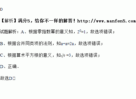 A. 20=0 B. a+a=a2 C. D. (a3)2=a6