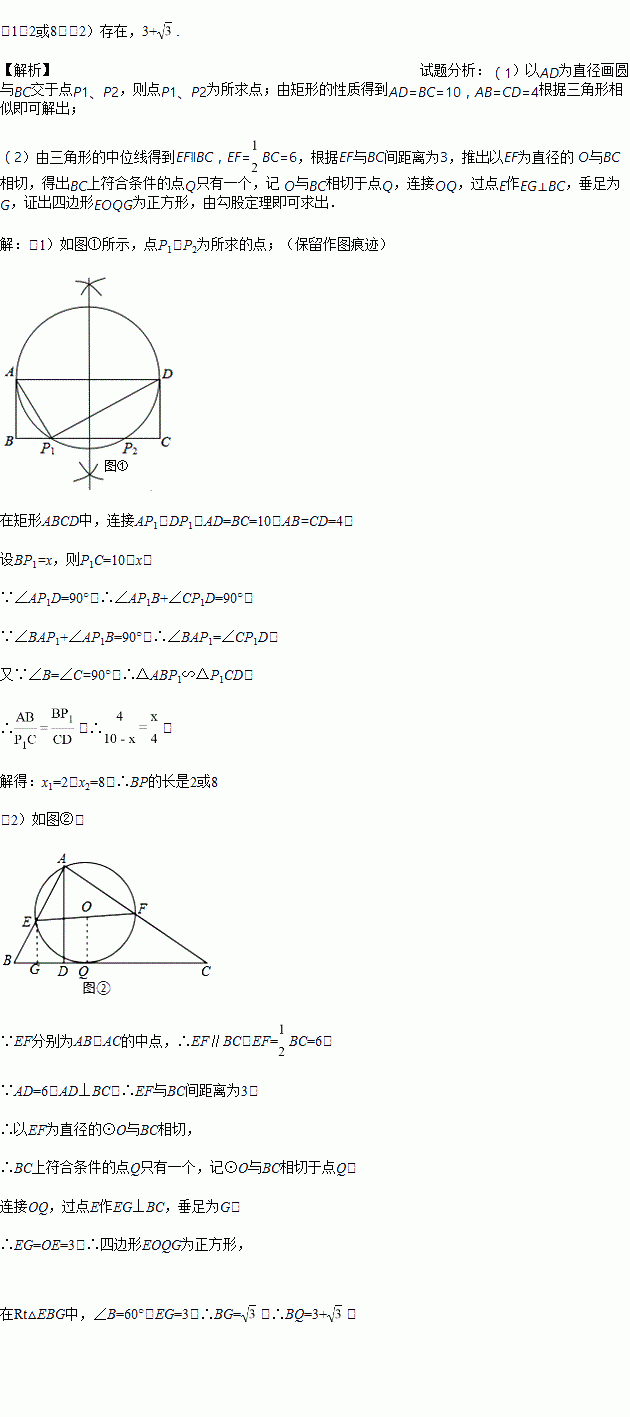 (1)如图①,在矩形ABCD中,AB=4,AD=10,在BC边上是否存在点P,使∠APD=90°,若存在,请用直尺和圆规作出点P并求出BP的长.(保留作图痕迹)