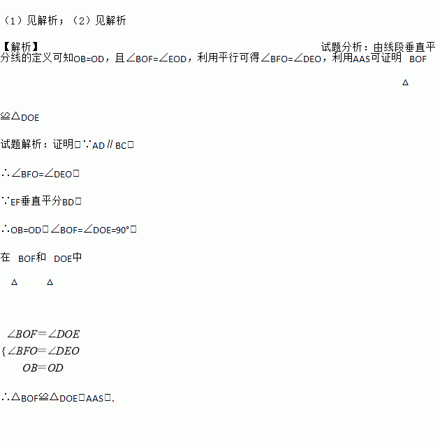 已知:如图, AD∥BC,EF垂直平分BD,与AD,BC,BD分别交于点E,F,O.