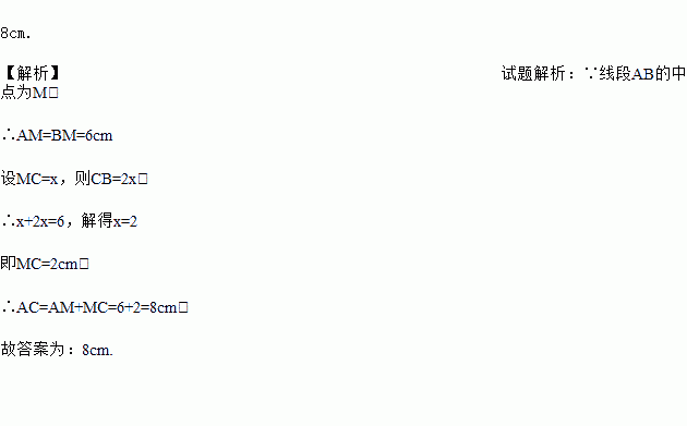 长度12cm的线段AB的中点为M,C点将线段MB分成MC:CB=1:2,则线段AC的长度为_____.