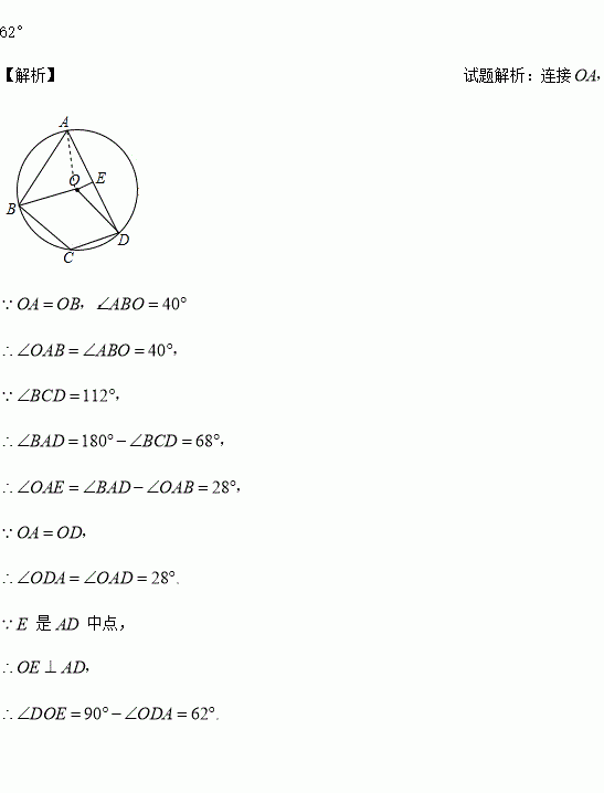 如图,点A,B,C,D在⊙O上,E是AD的中点,若∠ABO=40°,∠BCD=112°,则∠DOE的度数为____.