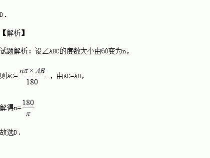 如图,将等边△ABC的边AC逐渐变成以B为圆心、BA为半径的,长度不变,AB、BC的长度也不变,则∠ABC的度数大小由60°变为( )