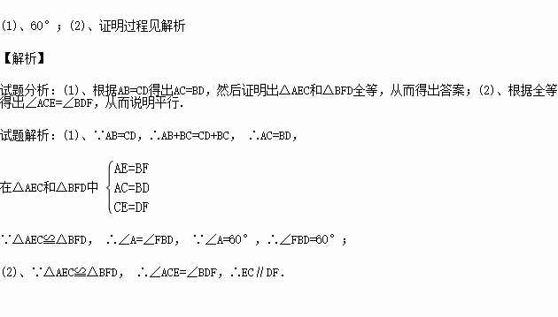 已知:如图,AB=DC,AE=BF,CE=DF,∠A=60°.