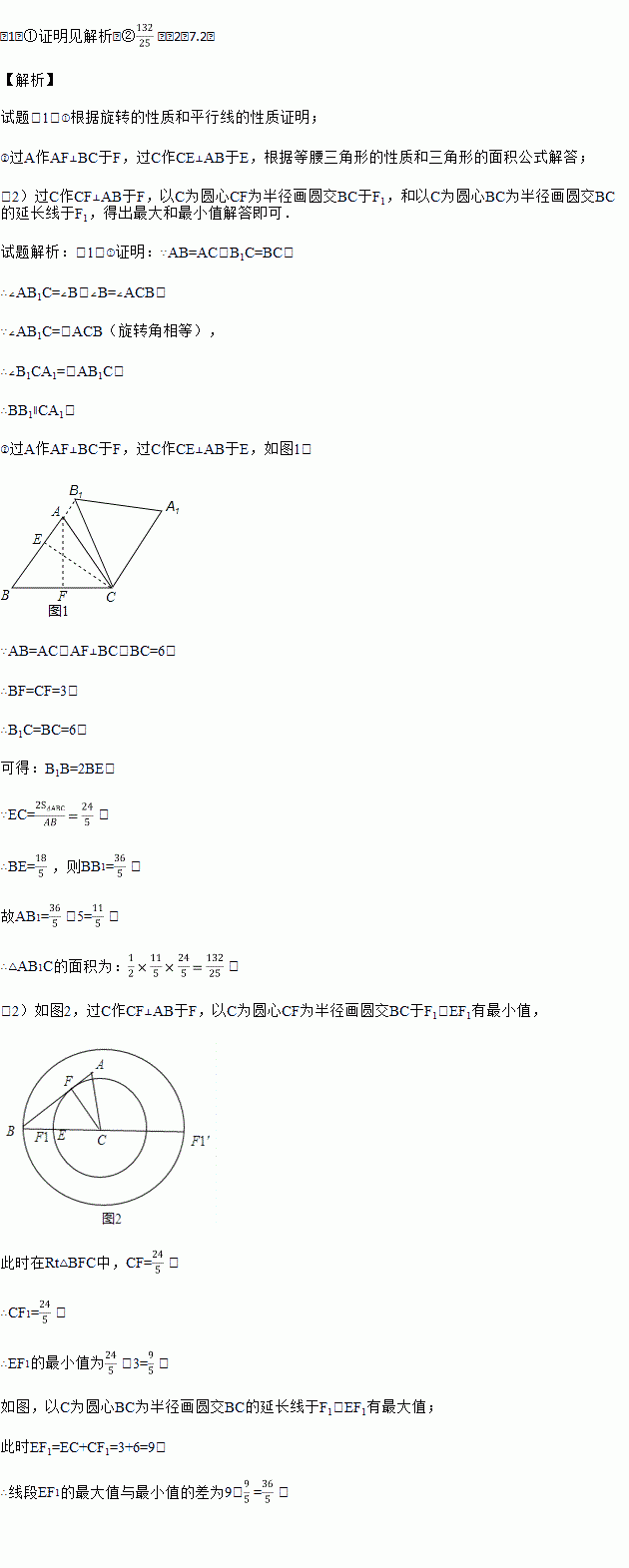 (2)如图2,点E是BC边的中点,点F为线段AB上的动点,在△ABC绕点C顺时针旋转过程中,点F的对应点是F1,求线段EF1长度的最大值与最小值的差.
