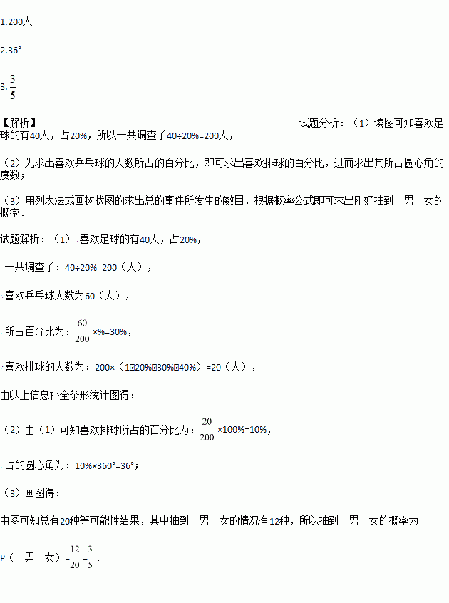 (3)若调查到爱好“乒乓球”的5名学生中有3名男生,2名女生,现从这5名学生中任意抽取2名学生,请用列表法或画树状图的方法,求出刚好抽到一男一女的概率.