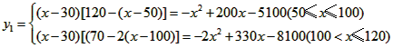 某品牌专卖店准备采购数量相同的男女情侣衬衫,并以相同的销售价x(元)进行销售,男衬衫的进价为30元,当定价为50元时,月销售量为120件,售价不超过100元时,价格每上涨1元,销量减少1件;售价超过100元时,超过100元的部分,每上涨1元,销量减少2件。受投放量限制衬衫公司要求该专卖店每种衬衫每月订购件数不得低于30件且不得超过120件。该品牌专卖店销售男衬衫利润为y1 (元),销售女衬衫的月利润为y2(元),且y2与x间的函数关系式为