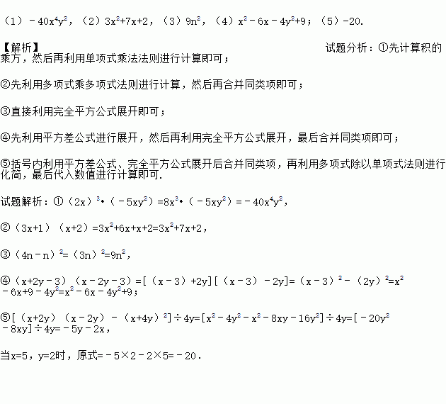 (1)﹣40x4y2,(2)3x2+7x+2,(3)9n2,(4)x2﹣6x﹣4y2+9;(5)-20. 【解析】试题分析:①先计算积的乘方,然后再利用单项式乘法法则进行计算即可; ②先利用多项式乘多项式法则进行计算,然后再合并同类项即可; ③直接利用完全平方公式展开即可; ④先利用平方差公式进行展开,然后再利用完全平方公式展开,最后合并同类项即可; ⑤括号内利用平方...