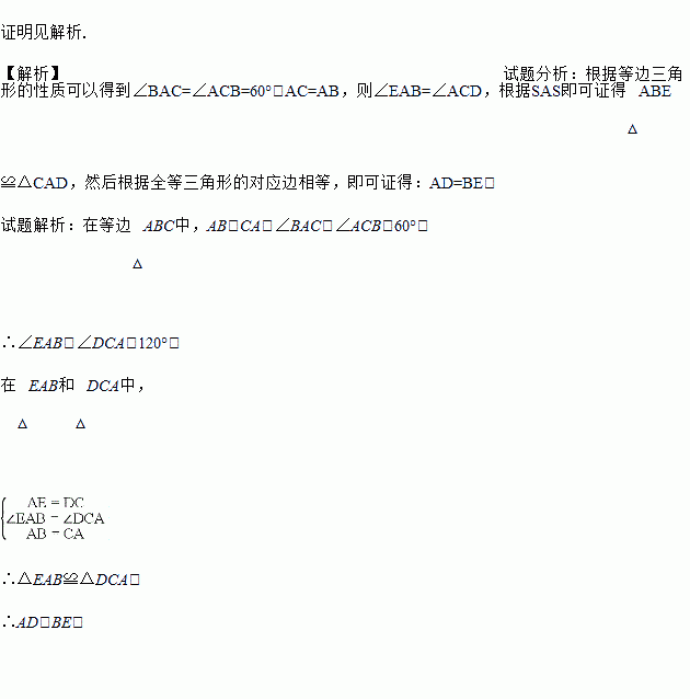 已知,如图,等边△ABC中,点D为BC延长线上一点,点E为CA延长线上一点,且AE=DC.求证:AD=BE.
