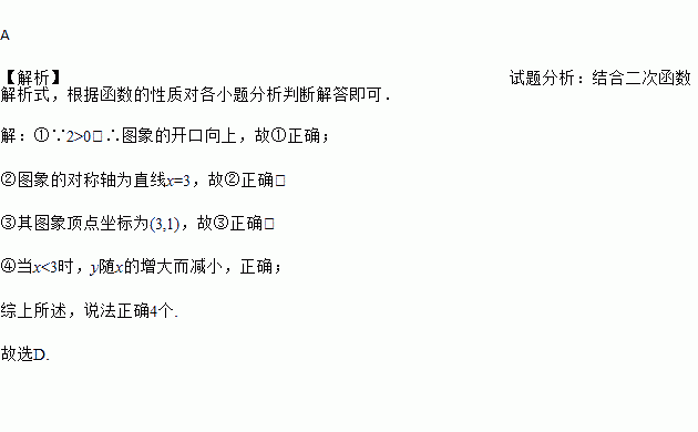 A 【解析】试题分析:结合二次函数解析式,根据函数的性质对各小题分析判断解答即可. 【解析】 ①∵2>0,∴图象的开口向上,故①正确; ②图象的对称轴为直线x=3,故②正确; ③其图象顶点坐标为(3,1),故③正确; ④当x<3时,y随x的增大而减小,正确; 综上所述,说法正确4个. 故选D.