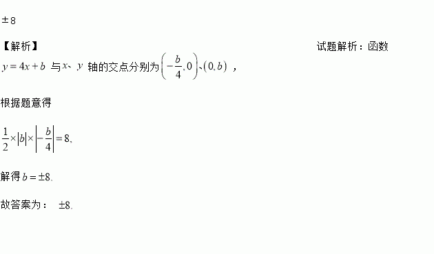直线y=4x+b与两坐标轴围成的三角形面积为8,则b=_________.