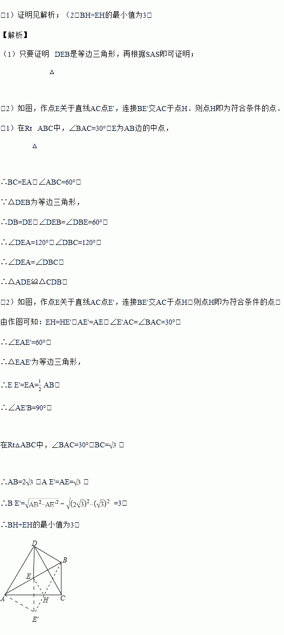 如图,在Rt△ABC中,(M2,N2),∠BAC=30°,E为AB边的中点,以BE为边作等边△BDE,连接AD,CD.