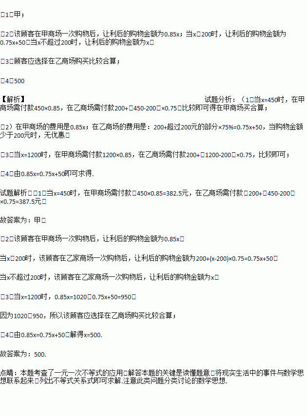 ¼×¡¢ÒÒÁ½¼ÒÉ̳¡ÒÔͬÑù¼Û¸ñ³öÊÛÏàͬµÄÉÌÆ·£¬ÔÚͬһ´ÙÏúÆÚ¼äÁ½¼ÒÉ̳¡¶¼ÈÃÀû³ê±ö£¬ÈÃÀû·½Ê½ÈçÏ£º¼×É̳¡ËùÓÐÉÌÆ·¶¼°´Ô¼ÛµÄ8.5ÕÛ³öÊÛ£¬ÒÒÉ̳¡Ö»¶ÔÒ»´Î¹ºÎïÖг¬¹ý200ÔªºóµÄ¼Û¸ñ²¿·Ö°´Ô¼ÛµÄ7.5ÕÛ³öÊÛ£®Ä³¹Ë¿Í´òËãÔÚ´ÙÏúÆÚ¼äµ½ÕâÁ½¼ÒÉ̳¡ÖеÄÒ»¼ÒÈ¥¹ºÎï.Éè¸Ã¹Ë¿ÍÔÚÒ»´Î¹ºÎïÖеĹºÎï½ð¶îµÄÔ¼ÛΪx(x£¾0)Ôª£®