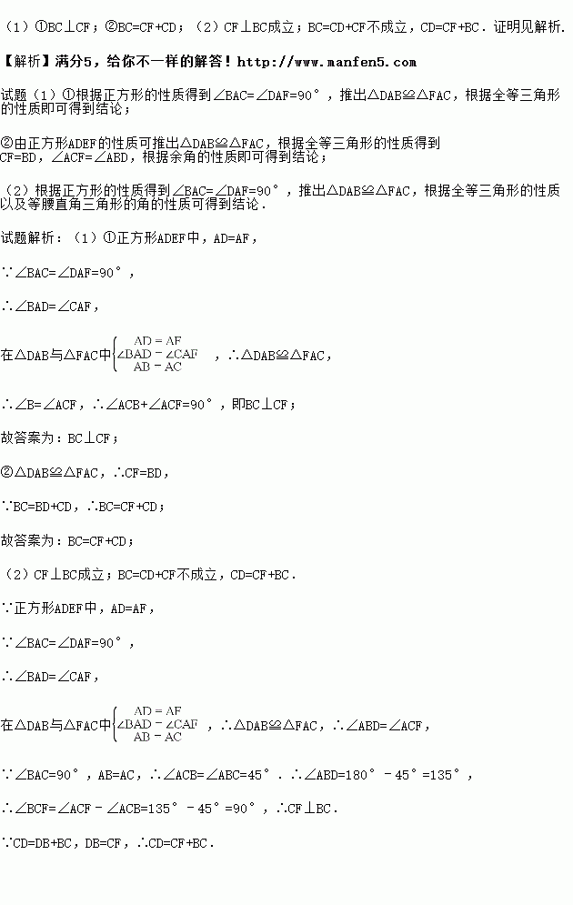 在△ABC中,∠BAC=90°,AB=AC,点D为直线BC上一动点(点D不与B、C重合),以AD为边在AD的右侧作正方形ADEF,连接CF.