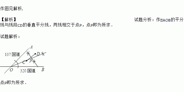 如图所示,107国道OA和320国道OB在某巿相交于O点,在∠AOB的内部有工厂C和D,现要建一个货站P,使P到OA和OB的距离相等,且使PC=PD,用尺规作出P点的位置.(不写作法,保留作图痕迹,写出结论)