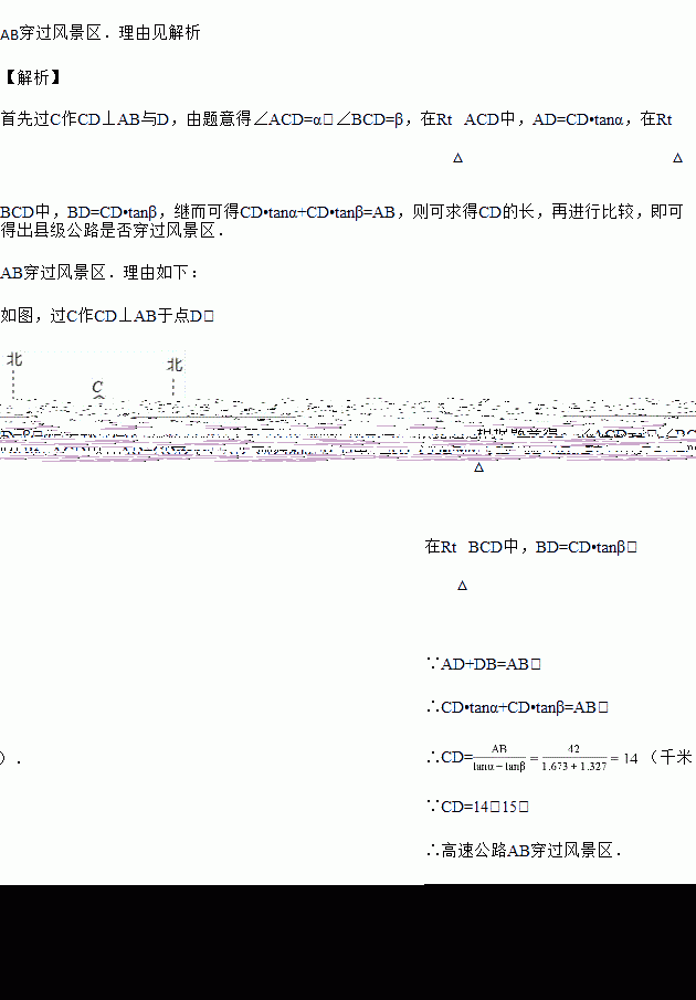 某市A,B两镇相距42千米,分别从A,B处测得某风景区中心C处的方位角如图所示,风景区区域是以C为圆心,15千米为半径的圆,tanα=1.673,tanβ=1.327.为了开发旅游,有关部门要设计修建连接A,B两市的县级公路.问连接A,B的两镇的县级公路是否穿过风景区,请说明理由.