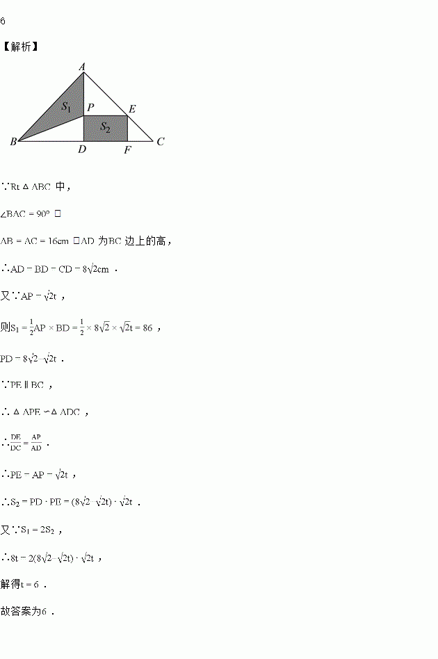 如图,在中,,,为边上的高,动点从点出发,沿方向以的速度向点运动.设的面积为,矩形的面积为,运动时间为秒(),则___________秒时,.