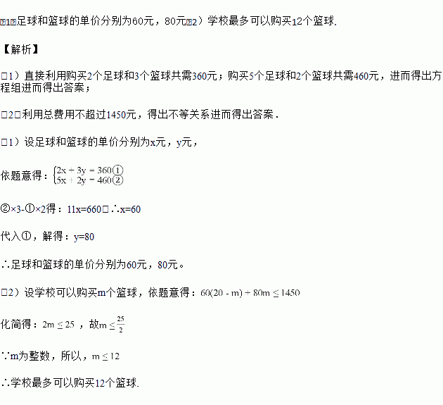 某学校准备购买若干个足球和篮球(每个足球的价格相同,每个篮球的价格相同),购买2个足球和3个篮球共需360元;购买5个足球和2个篮球共需460元.