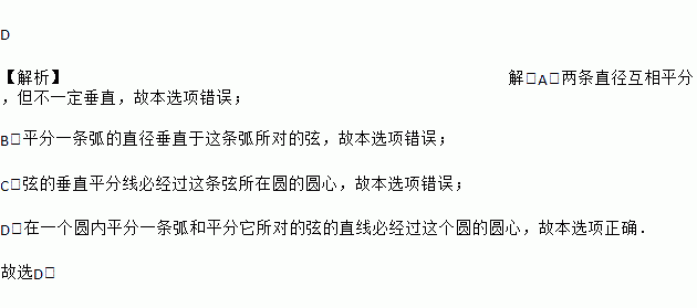 D ¡¾½âÎö¡¿½â£ºA£®Á½ÌõÖ±¾¶»¥ÏàÆ½·Ö£¬µ«²»Ò»¶¨´¹Ö±£¬¹Ê±¾Ñ¡Ïî´íÎó£» B£®Æ½·ÖÒ»Ìõ»¡µÄÖ±¾¶´¹Ö±ÓÚÕâÌõ»¡Ëù¶ÔµÄÏÒ£¬¹Ê±¾Ñ¡Ïî´íÎó£» C£®ÏҵĴ¹Ö±Æ½·ÖÏ߱ؾ¹ýÕâÌõÏÒËùÔÚÔ²µÄÔ²ÐÄ£¬¹Ê±¾Ñ¡Ïî´íÎó£» D£®ÔÚÒ»¸öÔ²ÄÚÆ½·ÖÒ»Ìõ»¡ºÍƽ·ÖËüËù¶ÔµÄÏÒµÄÖ±Ï߱ؾ¹ýÕâ¸öÔ²µÄÔ²ÐÄ£¬¹Ê±¾Ñ¡ÏîÕýÈ·£® ¹ÊÑ¡D£®